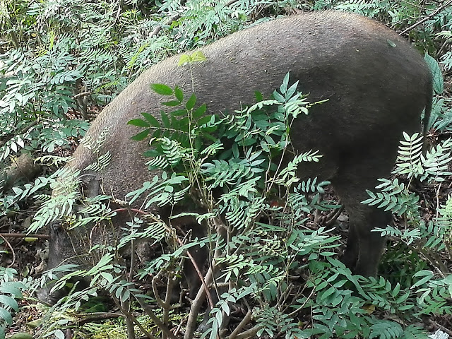 今日之行,又遇到野豬,是16個星期內第三次在這段路遇到野豬、另有兩次遇到馬騮。「麥理浩徑10段」我們以往走過無數次,遇到上述兩種野生動物的機會可謂絕無僅有,現在野豬馬騮頻頻現身,這引發了我一點感想:會不會是因為新冠肺炎疫情關係,政府把郊野公園內的燒烤區和野餐區封閉了,沒人燒烤野餐,垃圾桶裡就沒有剩餘食物,習慣了吃人類食物的野豬馬騮,在鄰區荃灣和元朗吃不飽,為找尋食物就愈走愈遠?來到更瘦瘠的屯門,恐怕更難「搵食」矣!